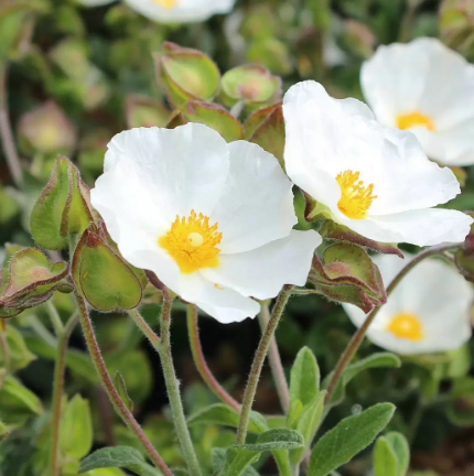 | Cistus x oblongifolius | Zistrose weiss | Bis 150 cm, weiss mit gelber Mitte. Sonnig. | 17.50 |  | Yes |